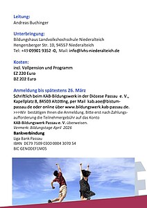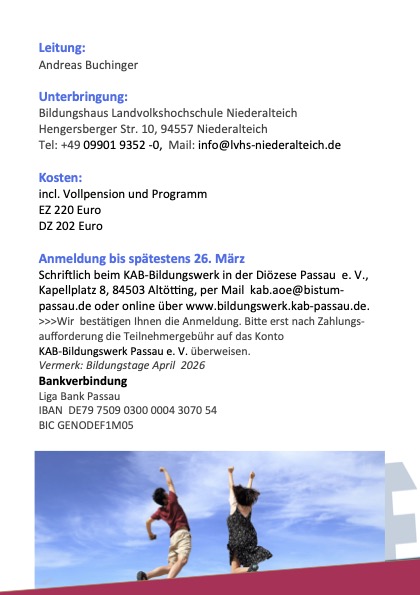 Schriftlich beim KAB-Bildungswerk in der Diözese Passau e. V., Kapellplatz 8, 84503 Altötting, per Mail kab.aoe@bistum- passau.de oder online über www.bildungswerk.kab-passau.de. >>>Wir bestätigen Ihnen die Anmeldung. Bitte erst nach Zahlungs- aufforderung die Teilnehmergebühr auf das Konto KAB-Bildungswerk Passau e. V. überweisen.