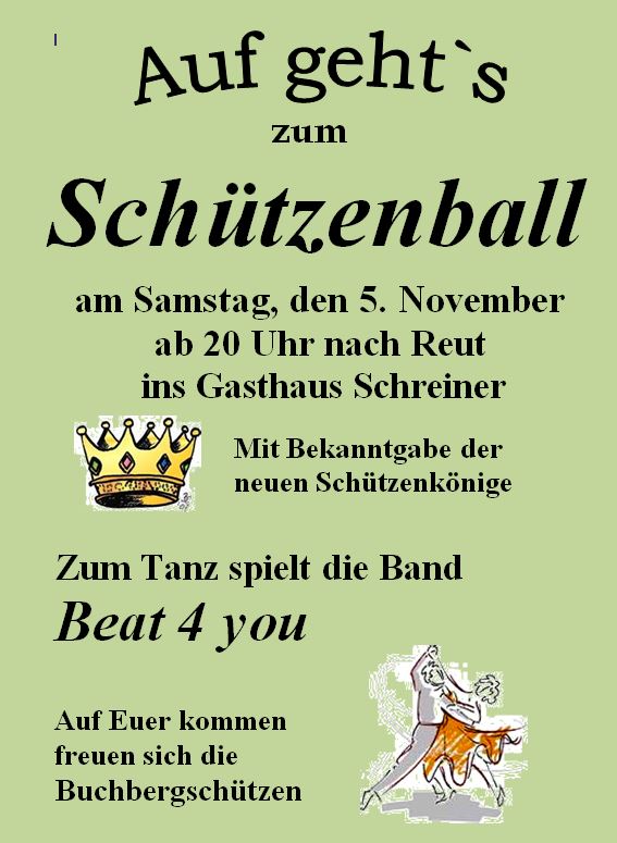 Zum diesjährigen Schützenball mit Bekanntgabe der neuen Schützenkönige laden die Buchbergschützen Reut am Samstag den 05.11.2022 ab 20 Uhr ins Gasthaus Schreiner in Reut ein. Zum Tanz spielt die Band Beat 4 you.