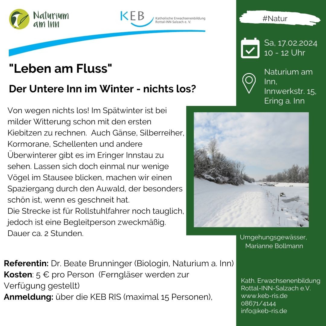 Im Spätwinter ist bei milder Witterung schon mit den ersten Kiebitzen zu rechnen, die aus ihrem Winterquartier am Mittelmeer zurückkehren. Auch Gänse, Silberreiher, Kormorane, Schellenten und andere Überwinterer gibt es im Eringer Innstau zu sehen. Lassen sich doch einmal nur wenige Vögel im Stausee blicken, machen wir einen Spaziergang durch den Auwald, der besonders schön ist, wenn es geschneit hat.
